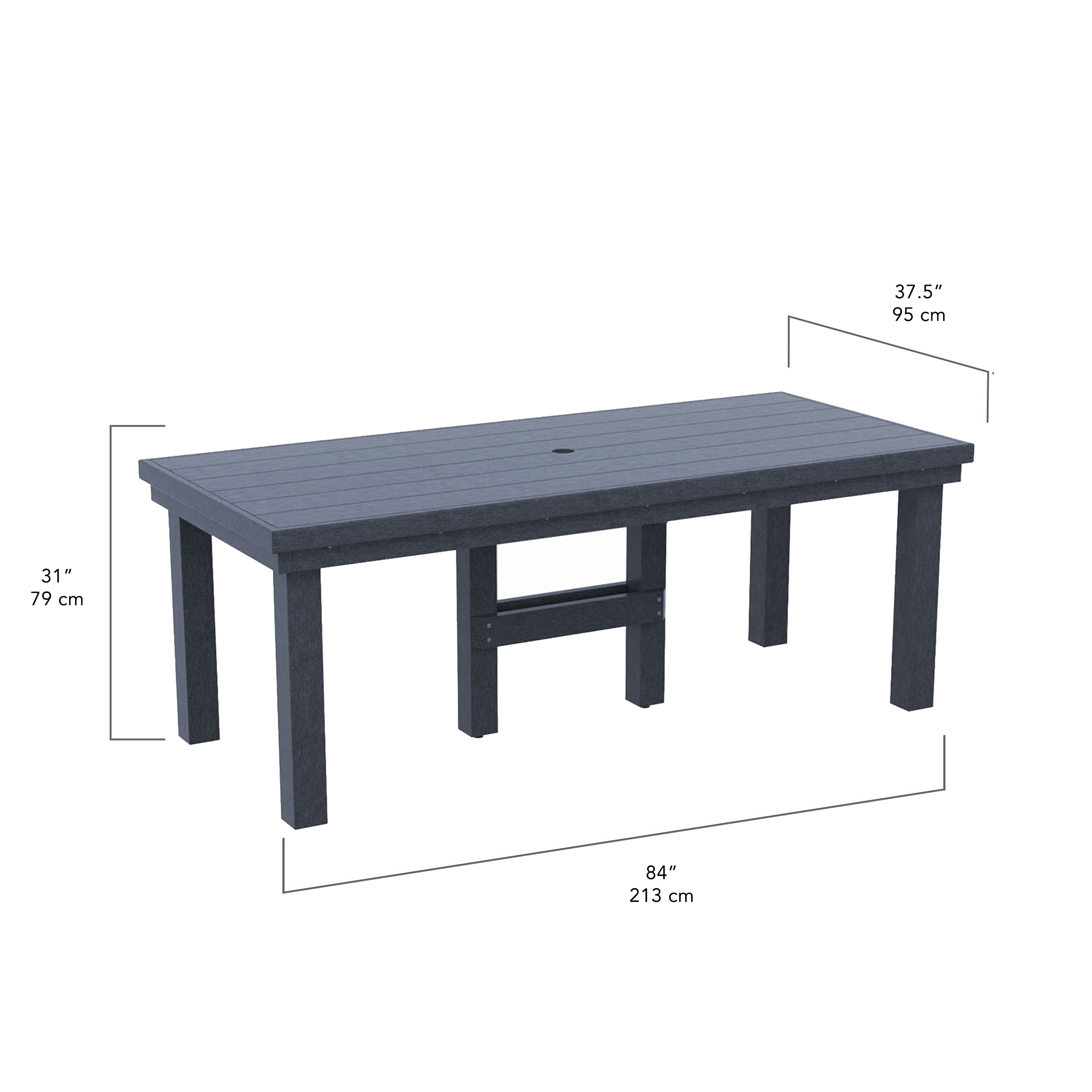 Crafted from recycled plastic and designed to withstand the elements, it offers the perfect balance of style, strength, and low-maintenance durability. A built-in 2" umbrella hole adds versatility for shaded outdoor dining.