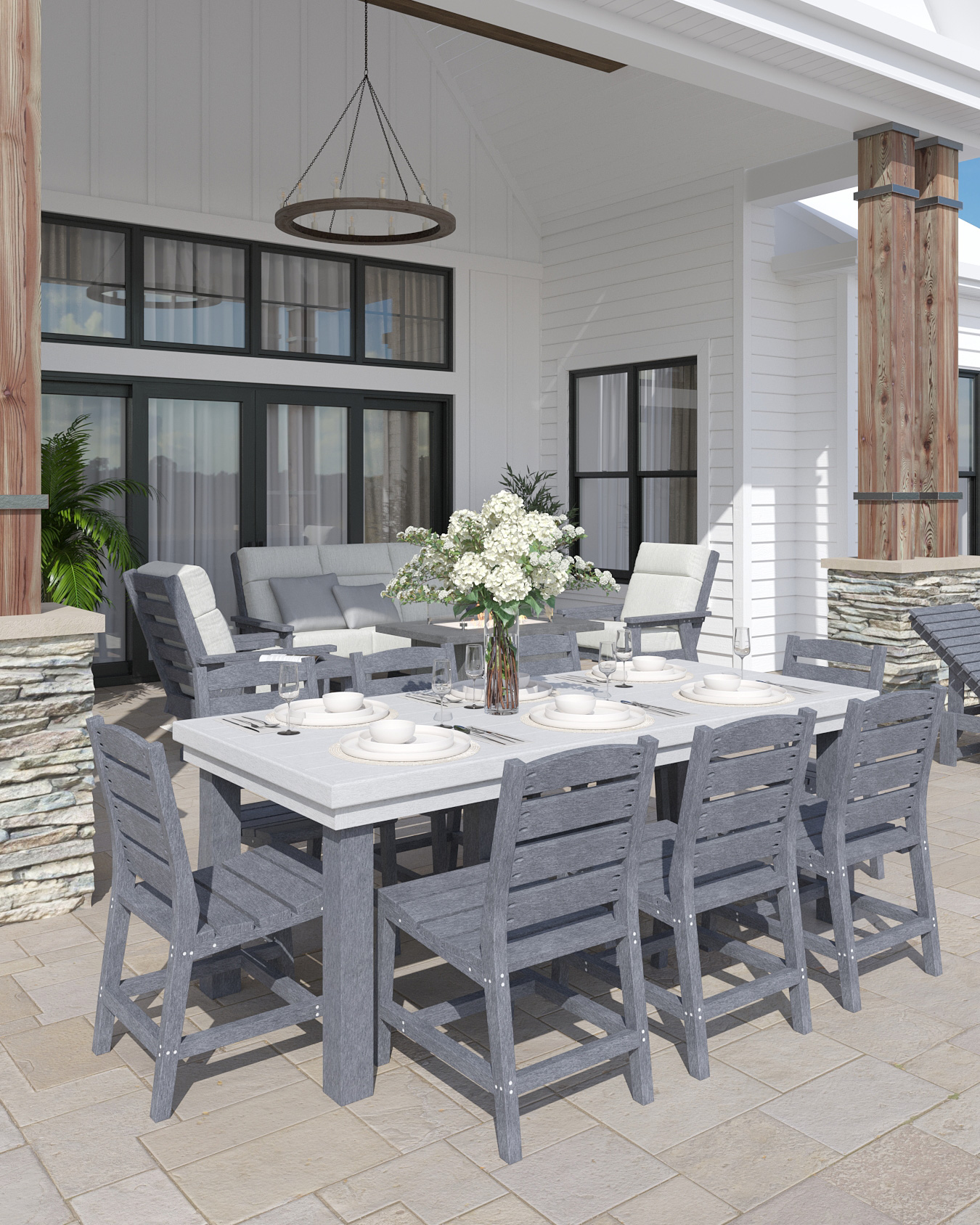 Crafted from recycled plastic and designed to withstand the elements, it offers the perfect balance of style, strength, and low-maintenance durability. A built-in 2" umbrella hole adds versatility for shaded outdoor dining.