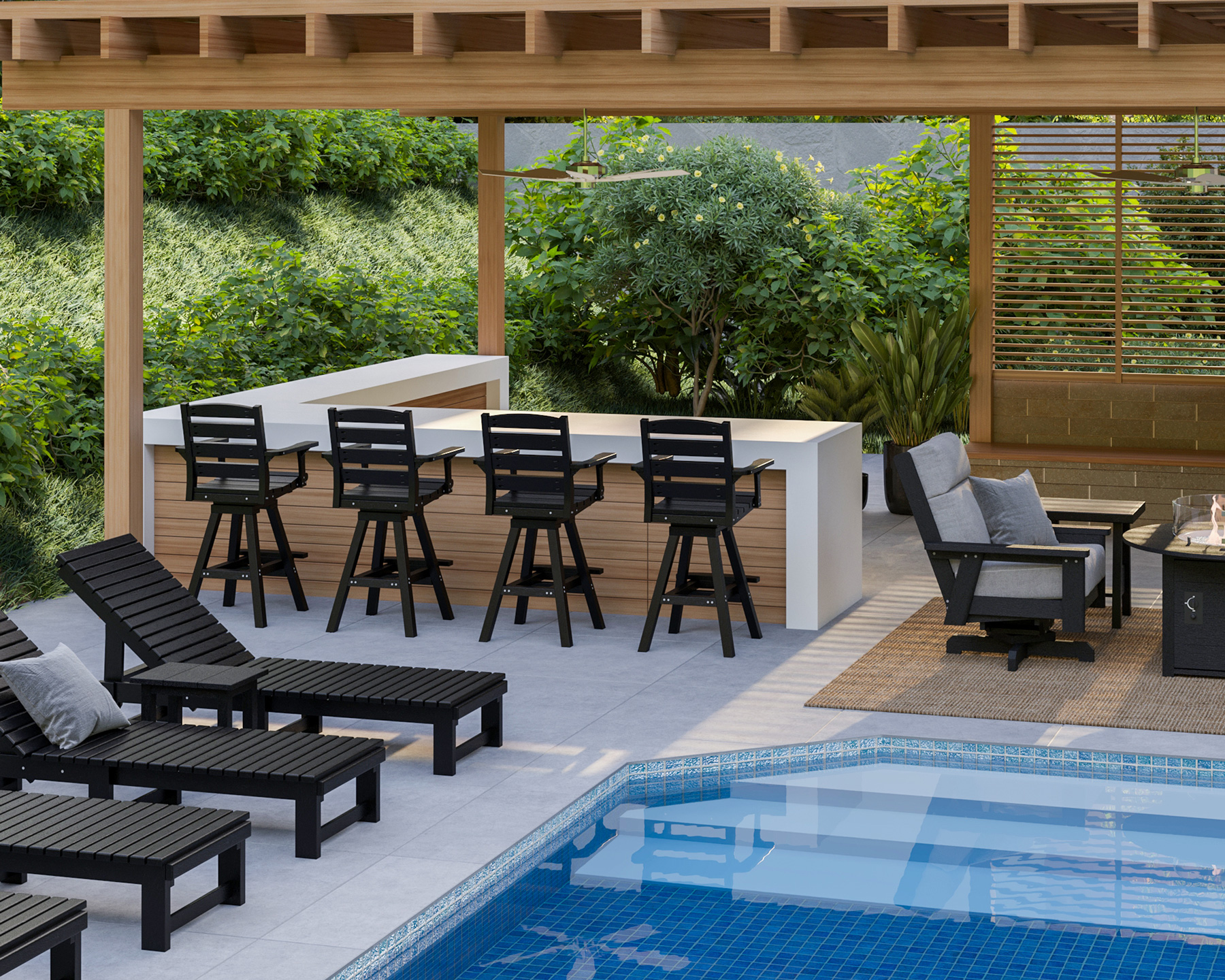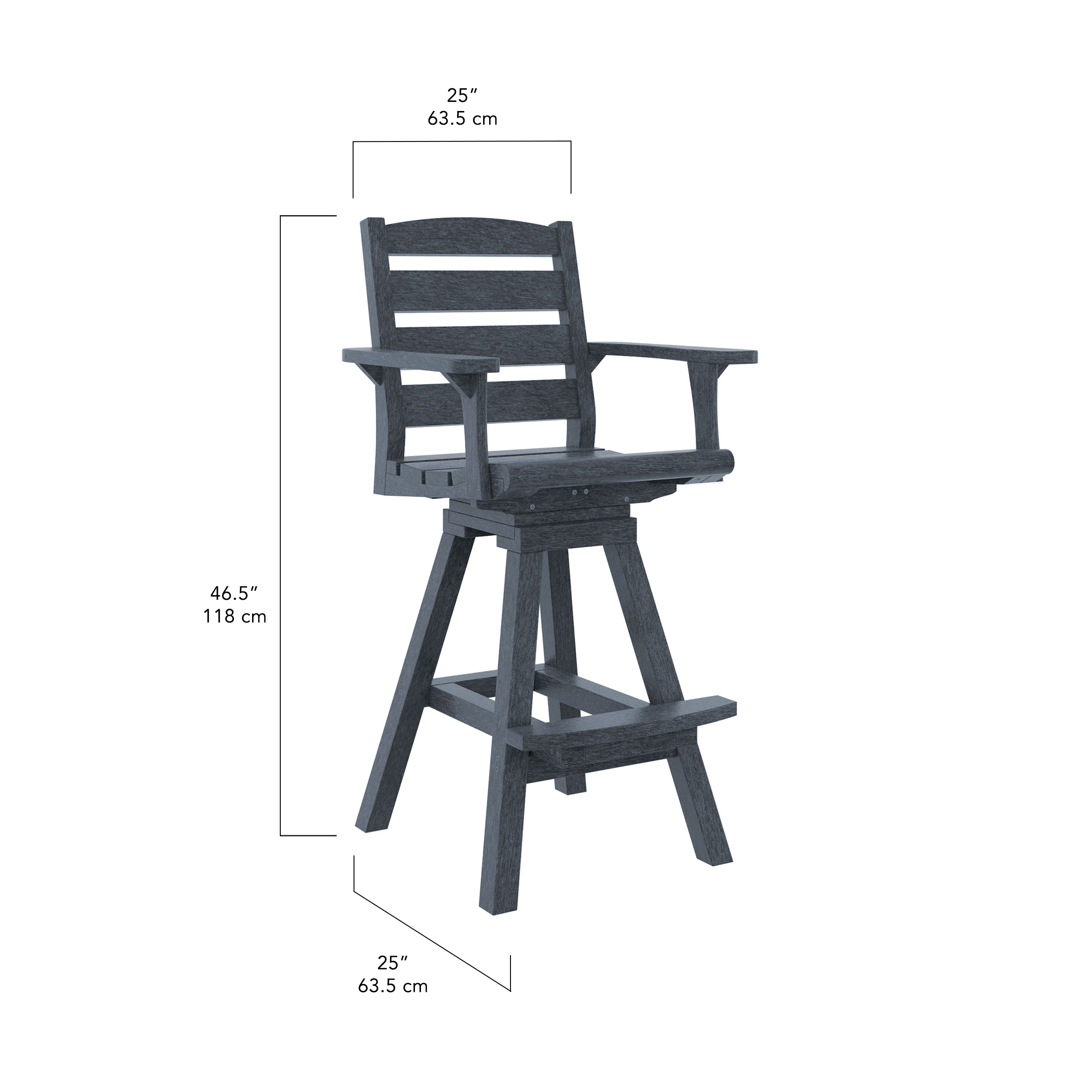 This armchair pairs perfectly with pub-height tables between 41"-42" tall, making it an ideal addition to patios, rooftop lounges, and commercial settings. The supportive arm design, sturdy frame, and easy-to-clean recycled plastic construction offer a seamless blend of style and everyday durability.